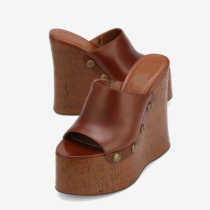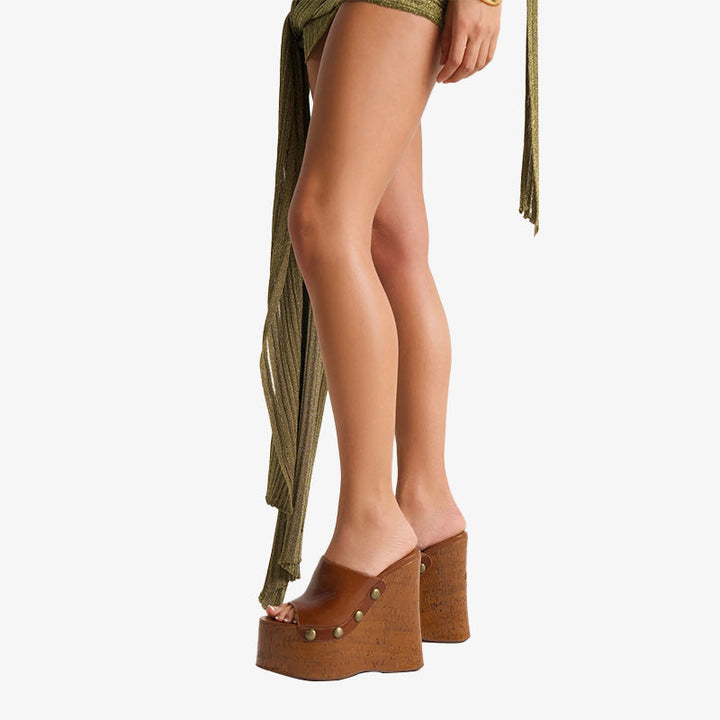 Elevate your summer style with these sleek peep toe wedge mules, crafted from premium brown calf leather. Featuring a 140 mm cork-wrapped platform heel, full leather lining and decorative nail accents for a refined finish.